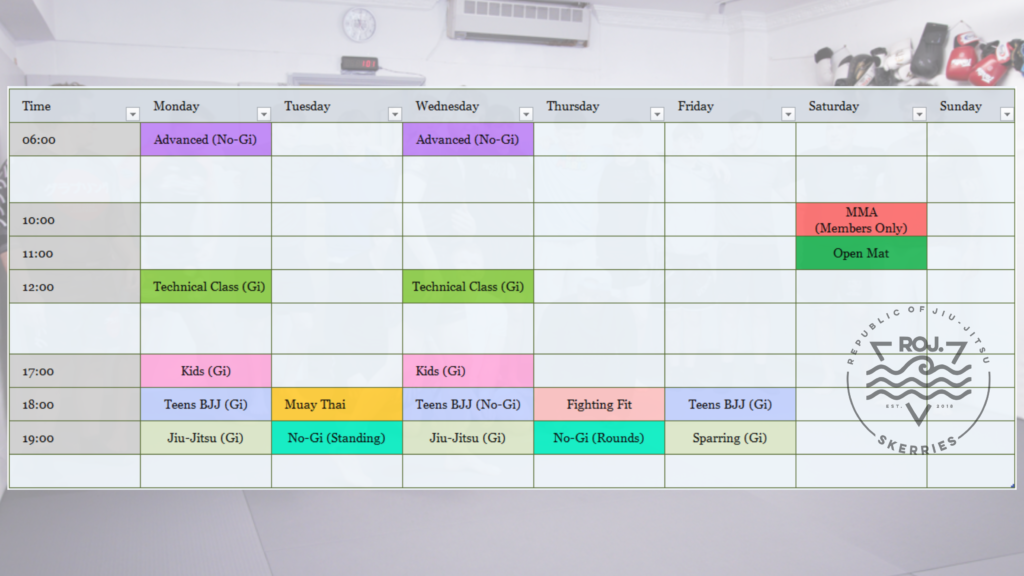 We offer a range of classes throughout the week, mainly Brazilian Jiu-Jitsu but also Muay Thai and a little bit of MMA.